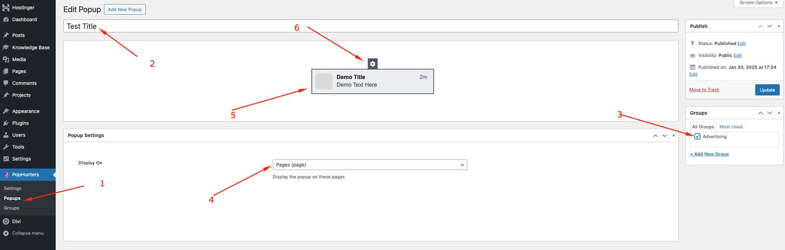 Each popup is a separate custom post that you can create just like a regular blog post.
